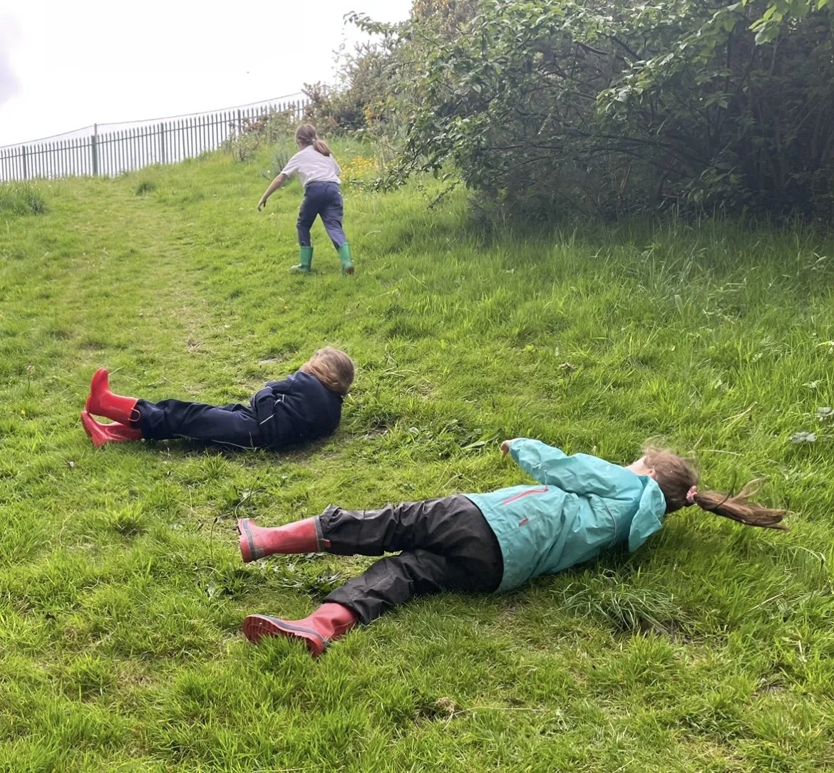 We had super fun at Forest school in the Glen River Park today (May 8th). We learned about knots, rolled down grassy hills, made creatures and things from clay and stuck them to trees, climbed over the river and had our lunch. Two of our girls even wrote a very important message with clay and stuck it to a tree. Some of the boys made a tractor from grass cuttings (look hard and you’ll see it!). The staff selfie got photo bombed! and we all went home with a very healthy exhaustion!